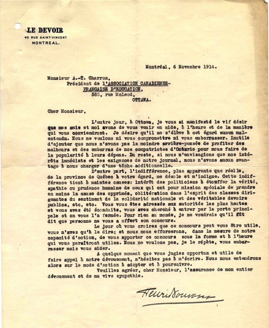 L'autre jour, à Ottawa, je vous ai manifesté le vif désir que mes amis et moi avons de vous venir en aide, à l'heure et de la manière qui vous conviendront. Je désire qu'il ne s'élève à cet égard aucun malentendu. Nous ne voulons ni vous compromettre ni vous embarasser. Inutile d'ajouter que nous n'avons pas la moindre arrière-pensée de profiter des malheurs et des embarras de nos compatriotes d'Ontario pour nous faire de la popularité à leurs dépens. Du reste, si nous n'envisagions que nos intérêts immédiats et les exigences de notre journal, nous n'avons aucun avantage à nous charger d'une tâche additionnelle.